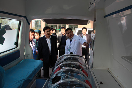 王同君组长首先查看了负压专用救护车,他仔细了解了负压救护车的原理、性能、运行状况等情况。随后来到发热门诊,详细询问了预检、分诊、留观、人员配备、防护措施等工作情况。