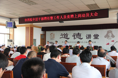 淄博市第四人民医院自3月28日召开“全员竞聘上岗动员大会”至今,先后六轮对职能科室正职、副职,业务科室主任、护士长、业务科室副主任、副护士长,经过民主测评、演讲答辩、组织考察等一系列严密程序,有96名干部通过组织和职工考验,成功当选。5月23日下午,医院召开中层干部聘任暨工作人员竞聘上岗动员大会,对竞聘上岗的干部进行聘任,同时对工作人员竞聘上岗工作进行了安排部署。