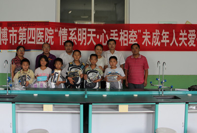 9月3日,淄博市第四医院省级青年文明号集体肿瘤二科、市级青年文明号集体急诊科和医院团总支在工会主席徐东的带领下,来到博山区池上镇李家学校,与这里的6名孩子结成帮扶对子,并给他们带去了新书包、新文具和慰问金,急诊科金传峰主任还为孩子们进行了健康查体。徐东主席询问了孩子们的生活学习情况,得知6名孩子都是农村留守儿童,爸爸在外打工,和妈妈在家生活,了解了孩子们的想法后,鼓励孩子们要好好学习,健康成长。