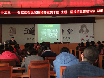 院感科特邀润兴消毒药业山东分公司总经理胡鹏为与会人员讲授了《手卫生——防控医院感染的有效手段》,培训图文并茂,生动有趣,深入浅出地说明了手卫生的重要性、必要性,对提高全院业务人员手卫生依从性奠定了坚实的基础