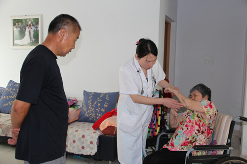 市第四医院的医疗专家来到一位类风湿患者家中,病人因类风湿疾病引发关节变形疼痛,专家仔细询问病史,为其进行体格检查和健康指导。病人因长期服药使家中陷入困境,专家赠送了部分应急医疗用品和免费体检卡,嘱咐她一定要定期查体,以便观察病情变化,并留下联系方式。
