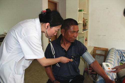 在另一位家庭困难的聋哑患者家中,医疗人员为其测血压、血糖、听心肺,由于病人血压较高,从未用药,专家写下药品处方,并嘱咐其家人一定要规范用药,患者家属连连道谢。