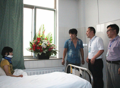 院领导得知小两口的不幸遭遇后,深深地为他们的爱情正能量所打动,由院党总支书记路慎国同志代表院领导班子来到病房,向携手与病魔抗争的小两口送上亲切的慰问和营养品,并安排医务科组织全院肿瘤专业的专家,会同省肿瘤医院的专家一起,为王慧进行了综合会诊。大家结合王慧的病情,经过深入、细致的讨论,制定了科学、合理的治疗方案。