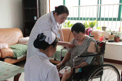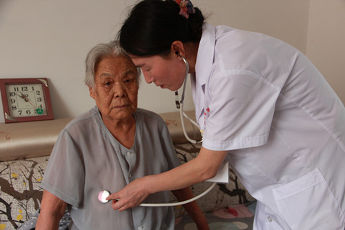 市第四医院的医疗专家来到一位90岁高龄的老人家中,老人患哮喘、慢阻肺多年,喘得非常厉害,专家仔细询问病史,为其测血压,听心肺,进行体格检查,看到老人平时吃的药都不对症,专家开出健康处方和用药指导,嘱咐其家人一定要对症治疗。