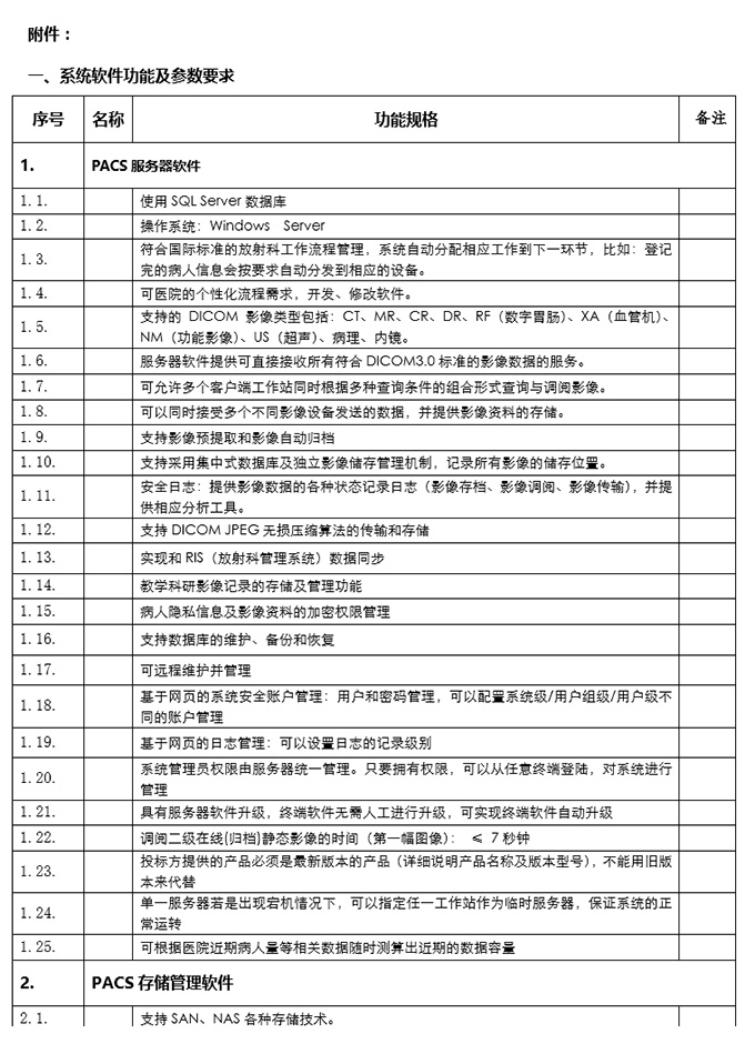 (2)软件价格分为两部分:第一部分:PACS软件,第二部分:PACS运行所需的系统软件及其它软件,第三部分:软件质保期后的服务费、新增设备接口费及与其他系统的接口费等。