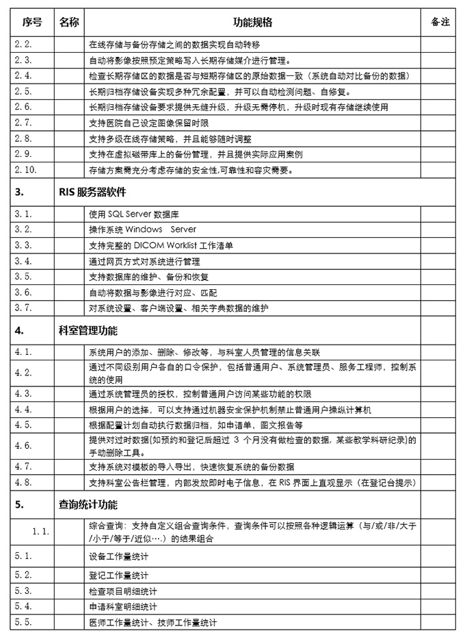 可进行患者影像检查预约;可进行预约管理,支持多个预约队列,并可在不同队列间切换;预约和检查注意事项能够反馈给申请医生和科室;进行影像检查登记,并支持三级部位分解登记;可定制的影像号分配策略,可统一分配,也可按设备分配;可接受、调用HIS中的电子申请单信息,根据申请单信息进行检查预约;可进行病人复诊登记、对重复登记项目内容自行预设与维护;对不同类型检查的收费可自行预设及维护,并自动进行计算显示;可按多种方式进行信息资料检索、查询及统计;