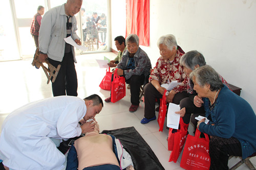 青年医师结合生活中经常发生的心脏猝死的意外情况,为社区居民详细讲解了心肺复苏、人工呼吸急救法的原理和操作步骤,并分别进行了现场演示。