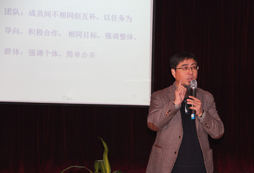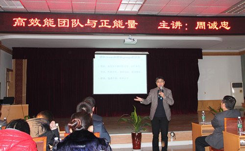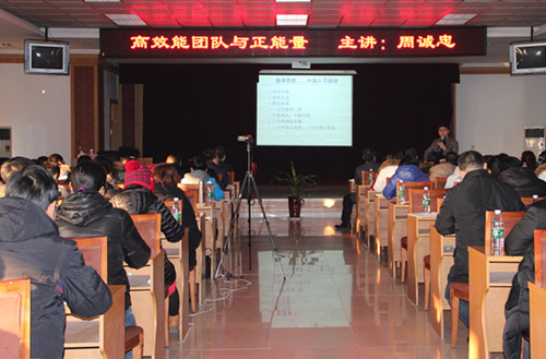 周教授从团队的含义、团队协作的原则、高绩效团队的六大特性、正能量的意义、如何调整自己释放正能量等方面进行了讲述。幽默的语言、大量贴合实际的案例、娴熟的专业化培训技巧、生动活泼的互动,让大家在互动中体验真谛,在轻松的氛围中认识到责任感和团队意识是一支高效能团队的基础。要打造一支像雁群一样的高效能团队,就要树立明确的团队目标,个人目标不仅要服从团队目标,更要为团队目标而不懈努力,只有这样我们的团队才能实现整体素质的提升。