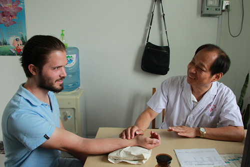 2015年7月中旬的一天上午,虽值三伏盛夏,气候炎热,但淄博市第四人民医院名中医工作室门前仍排满了候诊就医的病人,其中一名金发碧眼的外国人备受众人关注,他就是来自法国的杜沛阳(Dyprien)先生,还是一名"洋女婿"呢。这次杜先生随夫人省亲来到淄博,特意寻求治疗困扰自己多年的家族性遗传疾病-强直性脊柱炎,当多方打听到淄博市第四人民医院有位技术精湛的名中医时,忙赶来体验。