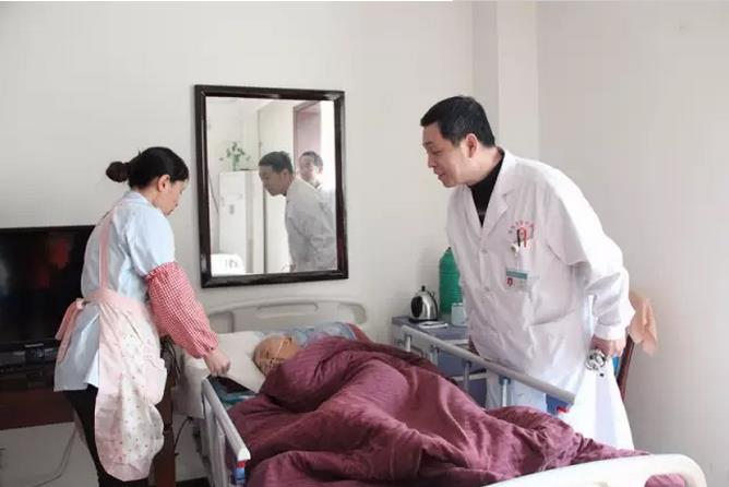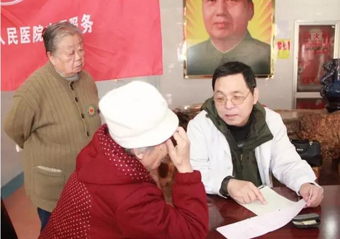 有的老人行动不便,内科医生到老人床前为其进行体格检查。