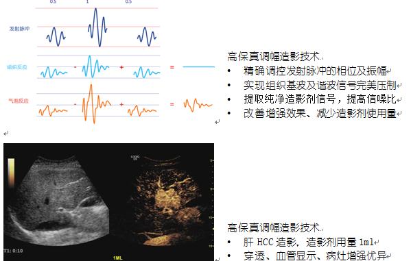 LOGIQ E9的高保真调幅造影技术与既往的翻转脉冲谐波造影技术不同,它通过精确调整发射脉冲的幅度及相位,发射三个不同相位和振幅的脉冲而实现造影剂信号的完美提取。与传统的翻转脉冲谐波造影技术相比具有更好的敏感性、组织信号抑制效果、可减少造影剂的使用量,使用较少的造影剂即可获得理想的造影成像。高保真调幅造影技术对硬件要求极高,它要保证先后发射的两个波形相位完全一致、振幅正好相差一倍,这样才能将组织信号去除干净,留下造影剂信号。所以,极佳的XDclear硬件平台的支持必不可少。