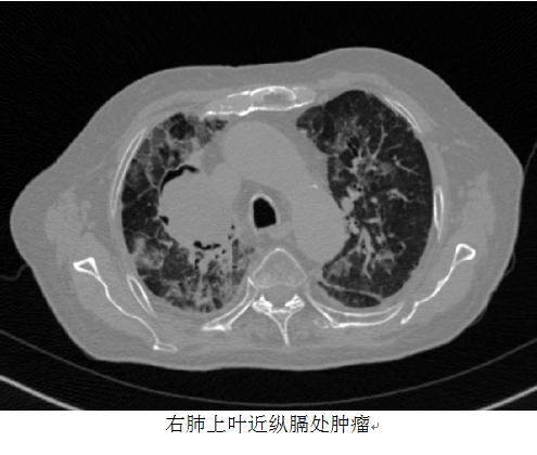 2017年3月,CT所见:右肺上叶近纵膈处可见一个最大截面约4.7cm×6.3cm的软组织肿块,病灶边缘毛刺,其内密度较均匀,增强后病灶轻度强化,临近支气管开口受压;双肺内可见散在可见斑片样、条索样及磨片玻璃样高密度改编,以右肺上叶为著;双侧胸腔内未见明显液体密度区;纵膈内未见明显肿大淋巴结显示;心包略增厚。