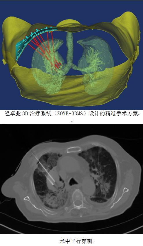 放射科宓主任医疗团队使用卓业科技的3D治疗系统(ZOYE-3DMS V1.0)设计出符合患者病情的个体化穿刺方案,并在3D打印联合模板的精准定位引导下,通过穿刺针道的均匀分布和放射剂量合理选择,为患者实施的手术达到了非常理想的治疗效果。