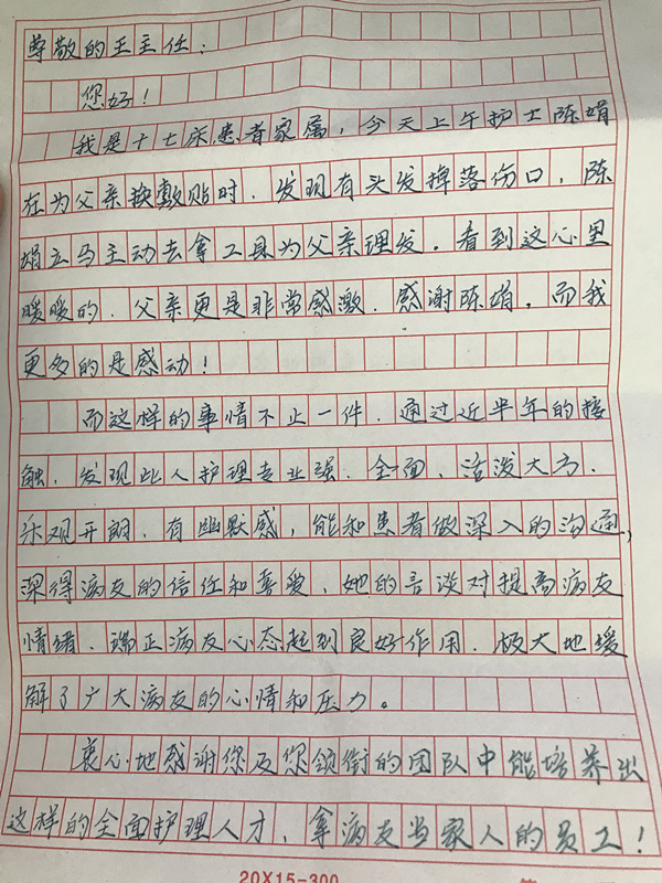 我是十七床患者家属,今天上午护士陈娟在为父亲换敷贴时,发现有头发掉落伤口,陈娟立马主动去拿工具为父亲理发,看到这心里暖暖的,父亲更是非常感激,感谢陈娟,而我更多的是感动!