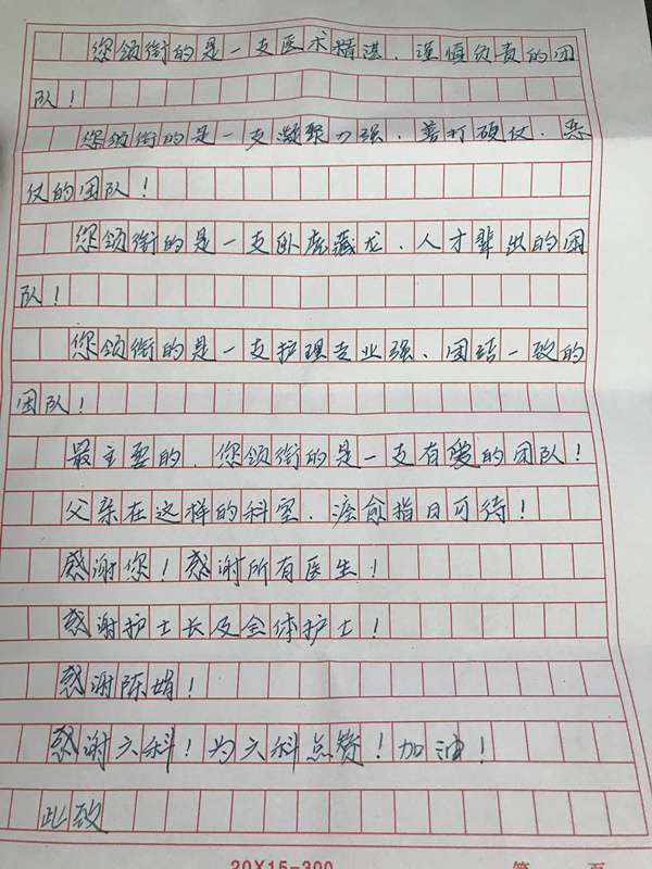 衷心地感谢您及您领衔的团队中能培养出这样全面护理人才,拿病友当家人的员工!
