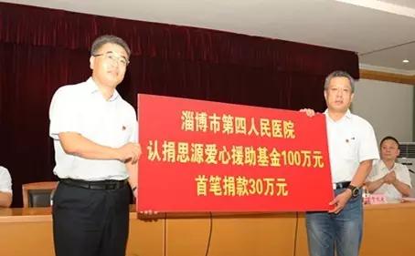 市第四医院认捐思源爱心援助基金100万元,首笔捐款30万元,市慈善总会颁发捐赠证书。