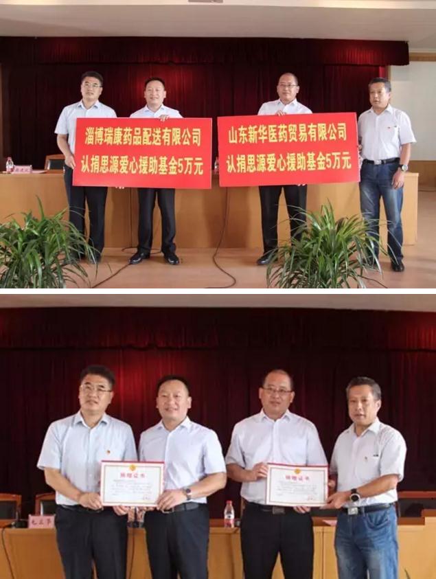 山东新华医药贸易有限公司、淄博瑞康药品配送有限公司认捐思源爱心援助基金5万元,市慈善总会颁发捐赠证书。