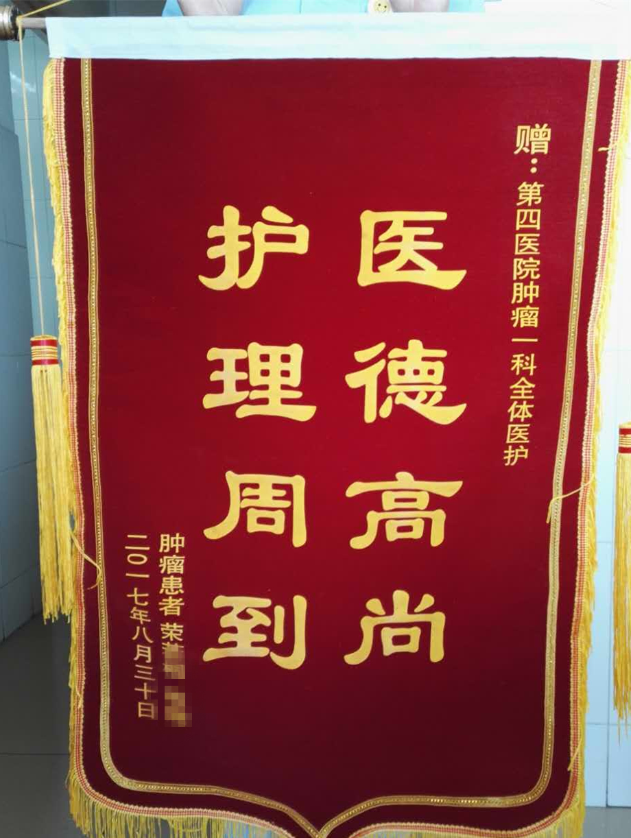 2017年8月30日上午,淄博市第四人民医院肿瘤一科一名老病人将一面写有“医德高尚,护理周到”的锦旗亲自送到医护人员手里。