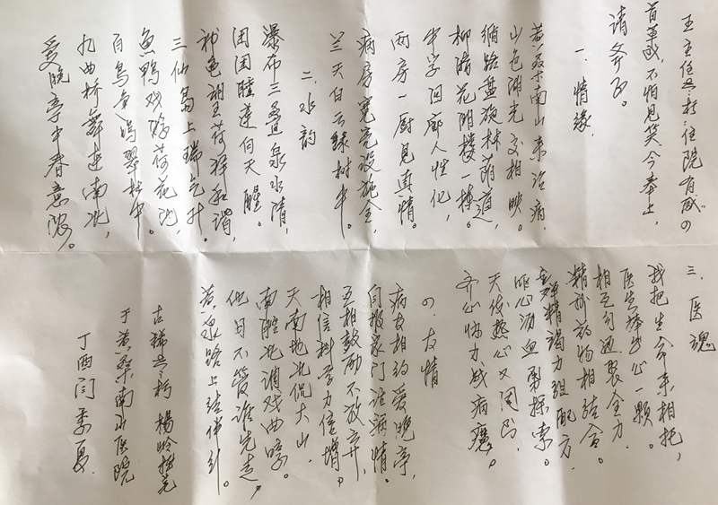 现年70岁的杨大爷于7月初入住淄博市第四人民医院肿瘤二科治疗,在住院的这段时间里,才华横溢的他创作了一首七言诗,亲自送到王克山副主任手里,以此来表达他对医院环境、医护团队的肯定与赞美。