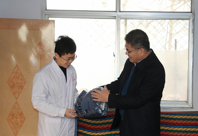 毛立亭院长一行人先后驱车来到袁芳医生被派驻的周村区南郊镇常旺村、史元建医生被派驻的淄川区商家镇冯家村,毛立亭院长仔细询问了两名医生的工作开展情况和遇到的困难,查看了村卫生室的布局及配套设施,针对村卫生室较冷的状况,医院为他(她)们购置了羽绒服和生活日用品。