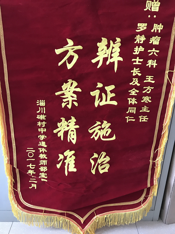 67岁的邵大爷刚结束最后一次化疗,就急忙地赶来送锦旗。他于今年6月份查出患病,遂入淄博市第四人民医院展开治疗。住院期间,王方寒主任为病人制定了切实可行的治疗方案,经过放疗、化疗,老人的病情日趋稳定、恢复良好,在出院之际特送锦旗表示感谢。