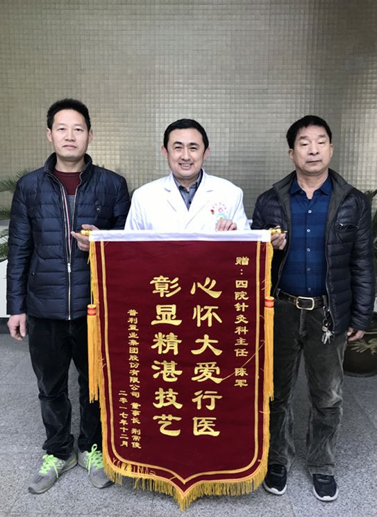 12月25日,临近元旦,看着老人恢复的越来越好,两名患者家属再次带着锦旗和感谢信来感谢陈军主任,家属激动地说:“近三年的时间陈军主任一直不间断地做着志愿服务,无论严寒酷暑都去帮老人针灸治疗,现在老人听到我们说话,就会流眼泪,说明他知道我们在说什么了。”陈军主任说:“我能做的就是尽我所学,为病患减轻痛苦,作为一名医者,不管是疑难杂症或者只是一个很小的病症,只要能够治愈患者的疾病和提升患者的生活质量,这就是最大的欣慰了!”