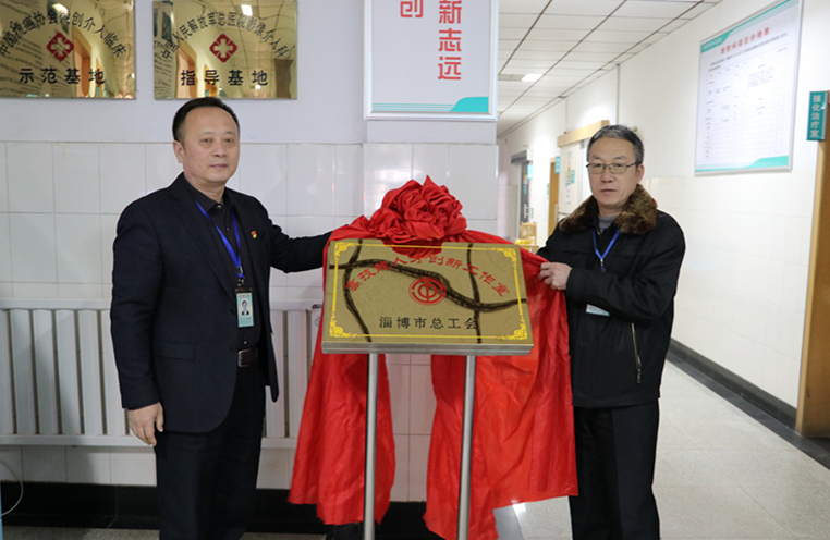 为表彰先进,更好地发挥创新示范引领作用,2018年1月18日上午,淄博市第四人民医院举行“宓兵高技能人才创新工作室”揭牌仪式。院党总支书记路慎国、工会主席徐东为“宓兵高技能人才创新工作室”揭牌 。