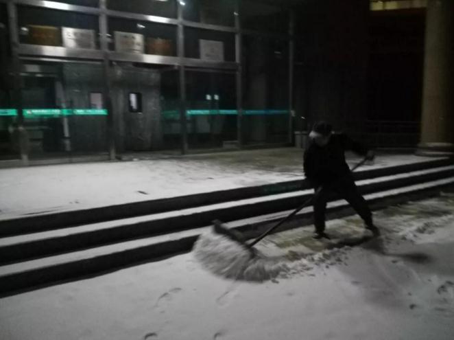 在夜色的笼罩下,大家不畏严寒,一心只想着为就诊患者和职工清理出方便之路。几近凌晨,急诊科、门诊楼、住院部、餐厅、放疗科,只要是患者需要经过的地方,都清理出来一条饱含着温情的方便之路,在台阶处铺上地毯,确保患者和职工安全出行。此时,大家才露出会心的笑容。
