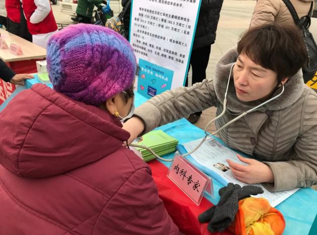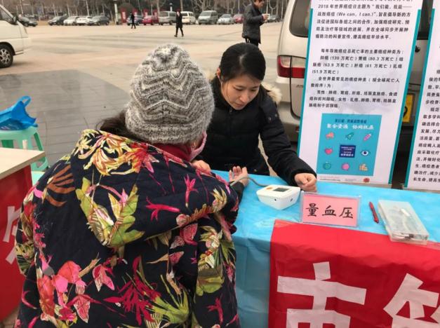 活动现场,淄博市第四人民医院医护人员为群众测量血压、进行听诊并向群众发放了印制精美的肿瘤科普宣传手册。