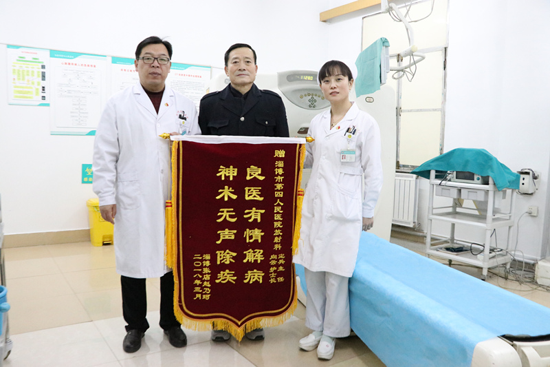 在朋友的介绍下,老人的儿子找到第四医院放射科宓兵主任为首的肿瘤微创团队。经过团队的充分论证,采取了氩氦刀冷冻消融、放射性粒子植入、微波消融治疗等联合序贯治疗,患者的肾肿瘤基本消失,双肺的转移瘤也得到很好控制,生活质量大大提高,老人说得最多的一句话就是:“是宓兵主任团队给了他第二次生命”。为了感谢在整个治疗期间,宓兵主任、向云副护士长等医务人员精心地治疗,细心地护理,耐心地疏导,特地制作了一面锦旗以表达感激之情。