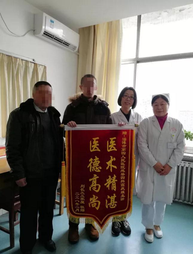 近日,淄川区27岁的患者刘某某和其家人将一面上书“医术精湛、医德高尚”的锦旗送到淄博市第四人民医院感染四科,以此感谢高庆娥副主任和全科医护人员对他的精心治疗。