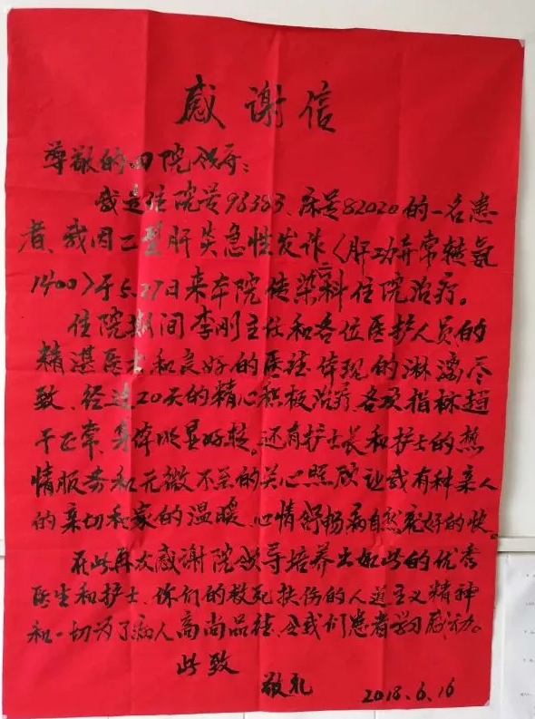 房某是一名慢性乙肝患者,慕名来到淄博市第四人民医院中西医结合感染科入院治疗,根据患者病情,李刚主任为其制定了个体化诊疗方案,给予保肝、抗病毒等综合治疗,经过缜密检查、精心治疗和细心护理,患者住院三周,病情即达到临床治愈标准,出院后感激之情难以言表,特亲笔书写感谢信,感谢中西医结合感染科李刚主任及全体医护人员。房某在信中说:住院期间李刚主任和各位医护人员的精湛医术和良好医德体现得淋漓尽致,还有护士长和护士的热情服务和无微不至的关心照顾让我有种亲人的亲切感和家的温暖,心情舒畅,病自然就好得快。感谢院领导培养出如此优秀的医生和护士。