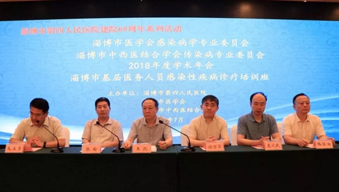 由淄博市第四人民医院、淄博市医学会、淄博市中西医结合学会主办的山东省继续医学教育项目淄博市基层医务人员感染性疾病诊疗培训班暨淄博市医学会感染病学专业委员会、淄博市中西医结合学会传染病专业委员会2018年度学术年会于7月14日上午召开。