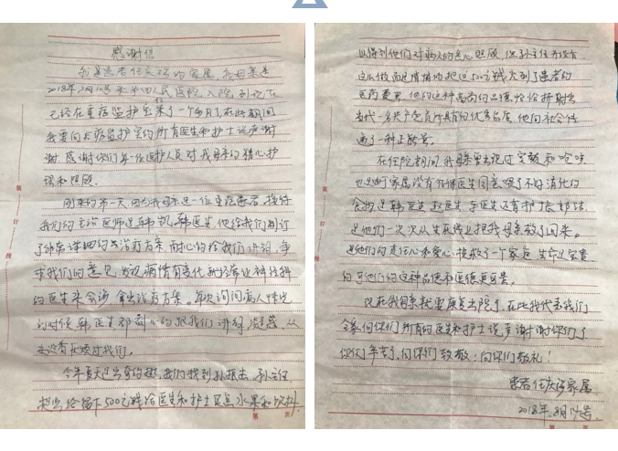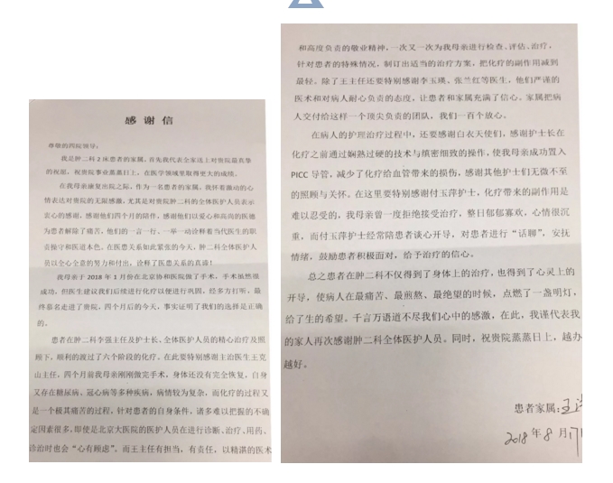 信中写道:“在我母亲康复出院之际,作为一名患者的家属,我怀着激动的心情表达对贵院的无限感激,尤其是对贵院肿瘤二科的全体医护人员表示衷心的感谢,感谢他们四个月的陪伴,感谢他们以爱心和高尚的医德为患者解除了痛苦,他们的一言一行、一举一动诠释着当代医生的职责操守和医道本色。在医患关系如此紧张的今天,肿瘤二科全体医护人员以全心全意的努力和付出,诠释了医患关系的真谛!”“总之患者在肿瘤二科不仅得到了身体上的治疗,也得到了心灵上的开导,使病人在最痛苦、最煎熬、最绝望的时候,点燃了一盏明灯,给了生的希望。千言万语道不尽我们心中的感激,在此,我谨代表我的家人再次感谢肿瘤二科全体医护人员。同时,祝贵院蒸蒸日上,越办越好。”