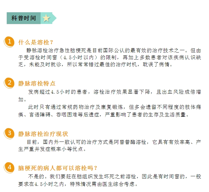 溶栓药物泵入1小时完毕,左下肢肌力、痛觉正常,溶栓后1小时,左上肢肌力、痛觉正常,溶栓后4小时言语清晰。内科副主任、神经内科主任马乃华在最快的时间内为患者实施了溶栓治疗。为预防溶栓后出血、保证患者生命健康,医护人员随时密切观察患者的病情变化及监测患者的各项生命体征及评估神经功能情况。溶栓24小时后病情稳定,患者家属焦急的表情中露出笑容,连声对医生护士表示感谢。