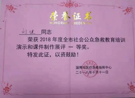 经过激烈角逐,淄博市第四人民医院急诊科副护士长刘健在参赛演示课件中脱颖而出,决赛中以总分第一的成绩获得一等奖,受到市急救指挥中心领导和评委的一致肯定。