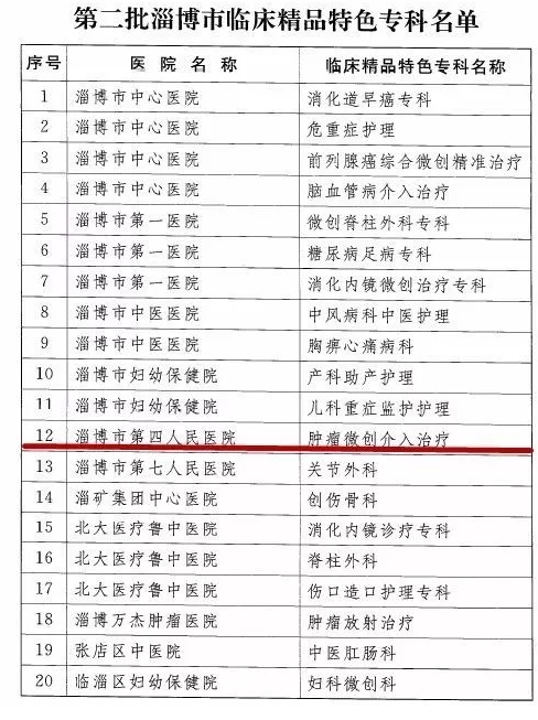 淄博市第四人民医院肿瘤微创介入治疗获得第二批“淄博市临床精品特色专科”称号。