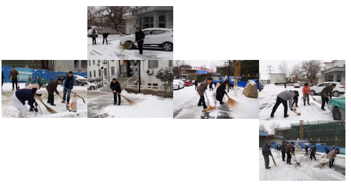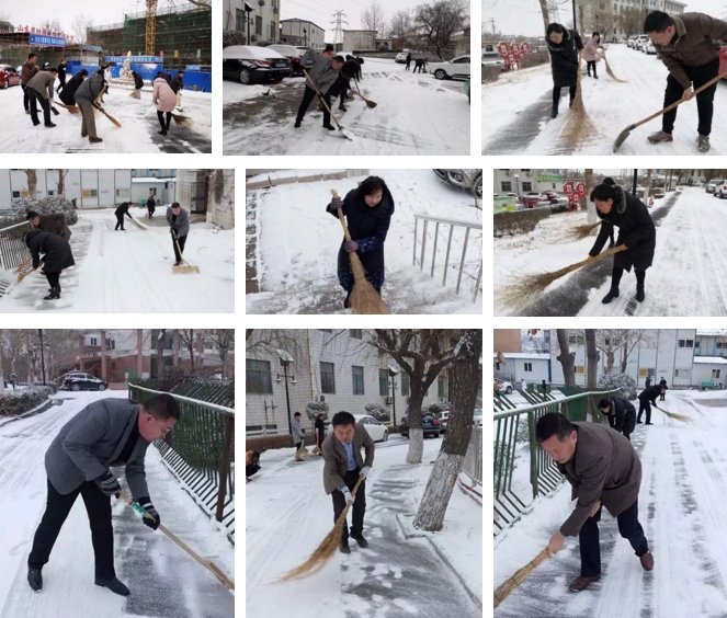 由于医院地势落差大,楼群分散,患者就诊需经过上坡下坡地段,斜坡坡度较大,为确保雪天院内道路畅通,患者就诊不受影响,没有通知,没有号召,未到上班时间,职能科室人员纷纷扛着铁锹、扫帚等工具,冒着寒冷的天气,主动到院内道路清扫积雪,并撒上盐和砂石。