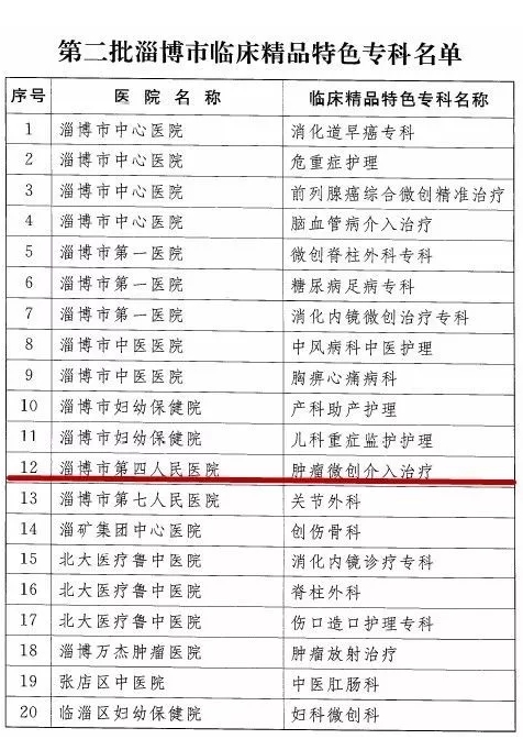 淄博市第四人民医院肿瘤微创介入治疗获得第二批“淄博市临床精品特色专科”称号。