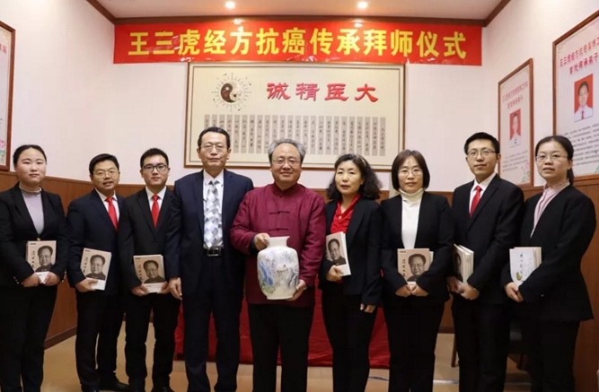 王三虎经方抗癌工作室的基本模式为临床坐诊、带教、病例讨论和教学查房等形式。在坐诊的同时,王三虎教授注重临床带教,结合实际病例,将晦涩难懂的经典著作与临床密切结合起来,活学活用,为弟子们找到了学习中医的门径,提高了学习中医的兴趣,明确了学习经典的方法,点燃学习经方的热情。在第四医院经方抗癌工作室,王三虎教授目前有传承弟子8人,其中主任医师并淄博市名中医1人、副主任医师2人、主治医师5人(3人为中医硕士研究生)。学习方式包括自学王三虎教授中医在线课程;经方抗癌线上班;跟师笔记、跟诊心得、临床日记等形式。王三虎教授每月一次在第四医院坐诊教学,其余时间由传承弟子每天上午在传承工作室为患者进行随诊调方。经过7个月的跟师学习,已初步掌握了中医经典及辨证施治的技巧,并且在临床实践中得到验证。八位弟子遵循师训,勤学善思,力争经过四年的跟师学习,把理论和技术真正学到手,并和现代医学相结合,进行创造性的转化和创新性的思维。