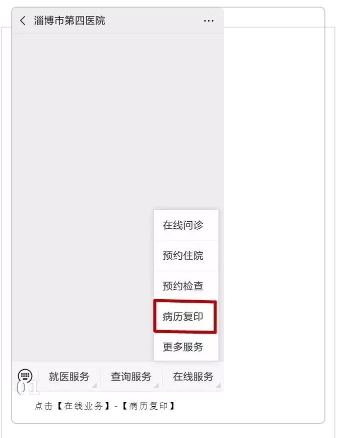 关注淄博市第四医院公众号【淄博市第四医院】,点击【在线业务】-【病历复印】-【申请复印】,填写申请信息,即可办理出院病历复印申请、费用支付、快递邮寄、进度查询等业务。
