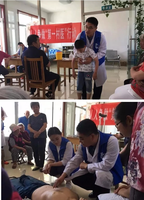 院长毛立亭到桓台县新城镇毛家村的卫生室义诊,为村民讲解高血压、糖尿病、肿瘤防治健康知识并现场演示海姆立克急救法、心肺复苏术。