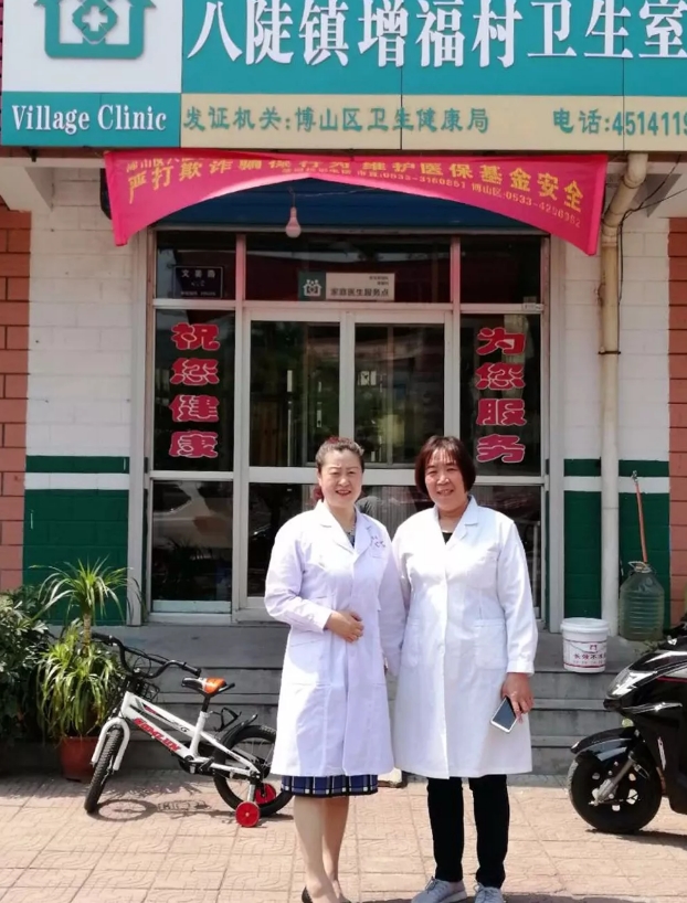 社会服务部主任肖本香到博山区八陡镇增福村和村里的村医张德莲为村民普及健康知识。