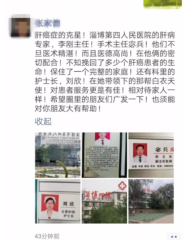 科主任李刚带领团队仔细检查、并邀请放射科主任宓兵进行会诊,详细制定治疗方案,于4月11日行CT下微波消融术,手术成功。在术后的护理中,张先生还特别感谢像家人一般的中西医结合感染科护理团队,她们舒心的照顾和言语的安抚使张先生体会到了家的感觉。在十一天的住院过程中,医护人员的工作作风、工作态度,他看在眼里,记在心里,为表达感激之情还特意发了一条朋友圈。