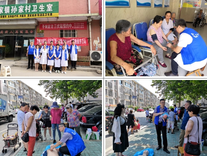 专家们不顾天气炎热,一到现场就忙活起来,为村民们健康咨询、测血糖、量血压、进行心肺复苏及异物卡喉的急救培训。