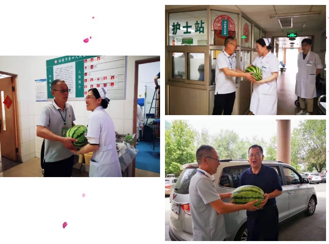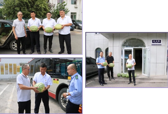 徐东主席及相关职能科室负责人为停靠在医院的137路公交车的司机师傅们、张店区公安分局崔军派出所民警送去消暑西瓜。