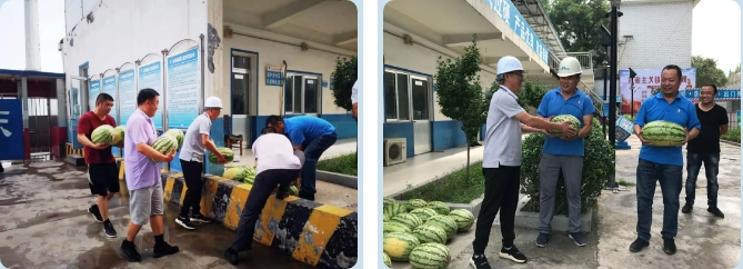 自三伏天气开始,室外烈日炎炎,骄阳似火,为了表达对高温天气下奋战在工作岗位的全院干部职工及医院门诊病房综合楼建筑工地建设者的关怀,2019年7月31日,淄博市第四人民医院工会开展“高温暑天送清凉”慰问活动,为坚守在一线的干部职工送去解暑的西瓜,送去一丝清凉。