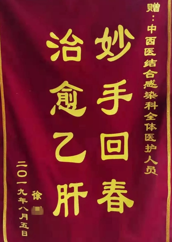 2019年8月9日,一位徐姓患者兴冲冲来到淄博市第四人民医院,为中西医结合感染科送来一面锦旗,上书:“治愈乙肝,妙手回春”,以此来感谢科室的医护人员。