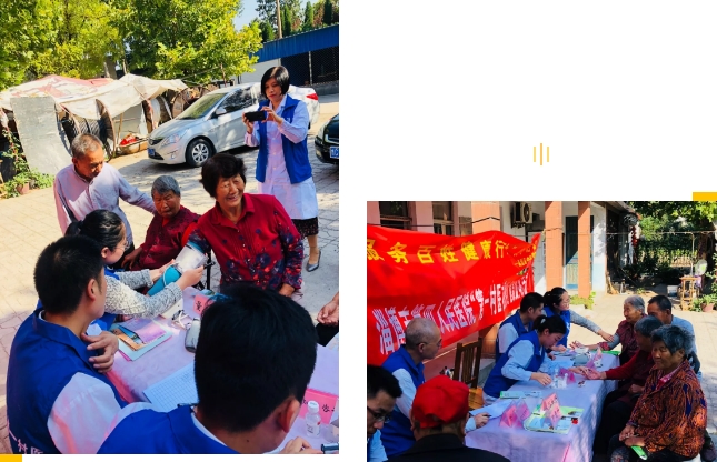 在北马庄卫生室内,志愿服务人员为村民量血压、测血糖,并分别从颈肩腰腿疼、疾病预防、合理用药、医保政策、合理膳食等方面对居民进行知识宣教。