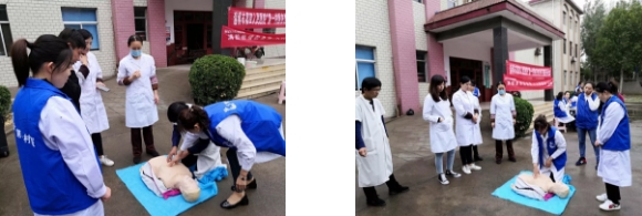 感染一科主管护师李丽与感染四科主管护师单文慧与田家村卫生室工作人员互动,讲解心肺复苏术。